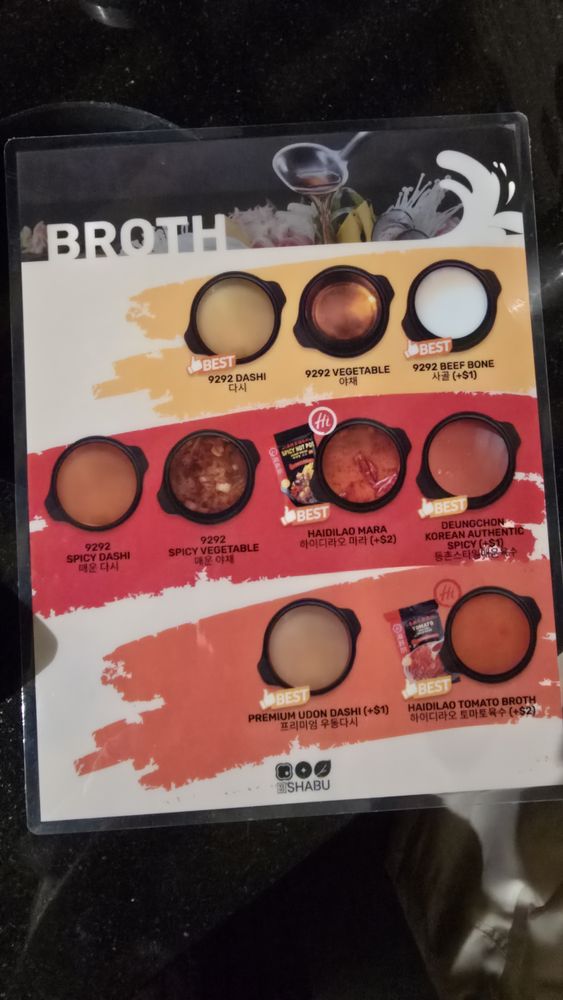 “ *9 broths: dashi(anchovy seaweed based), vegetable/spicy dashi, vegetable beef bone, mara. 3 new broths: deungchon(korean authentic spicy), tomato, udon-dashi *Basic shabu buffet: +70 vegetables, mushrooms, fishcakes, dumpling, noodles and more *If you wanna enjoy real shabu, you have to order protein: - One plate of protein from $7.99-$9.99 - Combo A is just like the basic shabu buffet but includes 1 plate of meat or seafood of your choice with $7, which is $2 cheaper - If you can eat more than 2 plates of protein, choosing unlimited for $37.99 would be better choice. - They have new protein - bulgogi(sweet soysauce based seasoning), which is perfect match with udon-dashi. *K-food and more - Tteokboggi, fried dumpling, fried rice, house-made kimchi, soba naodle - shrimp tempura roll, california roll, spring roll - dessert: fruit, salads, rice punch, cinnamon punch, pudding This place is every Buffet lovers paradise. The ambiance of the place was very clean and 9292 is just a great place to eat good hotpot on a chilly day. This is a must try if you are looking for something to warm the soul. ”